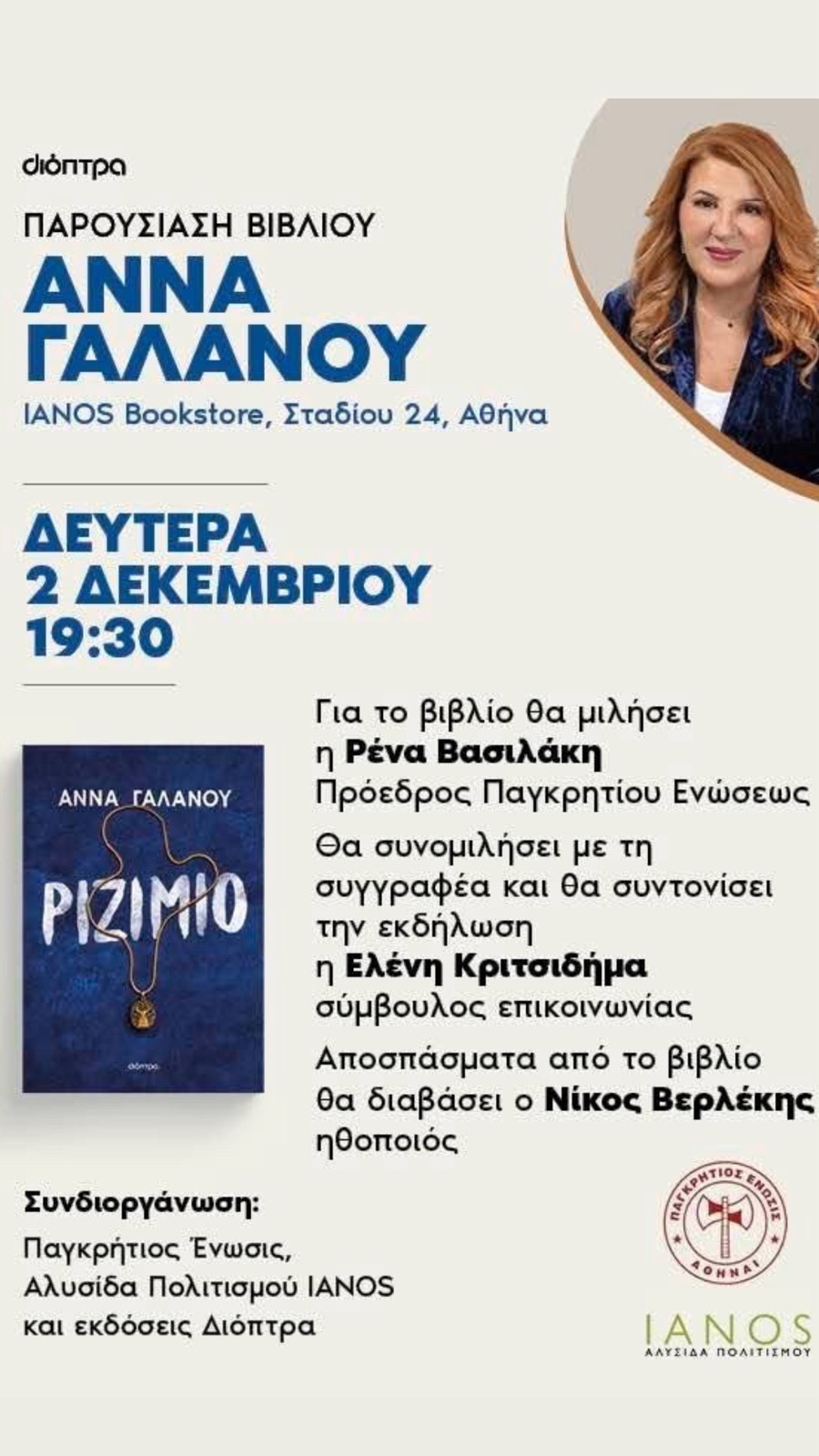 Στο βιβλιοπωλείο Ianos, η Άννα Γαλανού παρουσίασε το νέο της βιβλίο, με την Παγκρήτιο Ένωση να υποστηρίζει την εκδήλωση. Για το βιβλίο μίλησε η Πρόεδρος της Παγκρητίου Ενώσεως, Ρένα Βασιλάκη, Πρόεδρος Παγκρητίου Ενώσεως, ενώ αποσπάσματα από το βιβλίο διάβασε ο ηθοποιός, Νίκος Βερλέκης.
